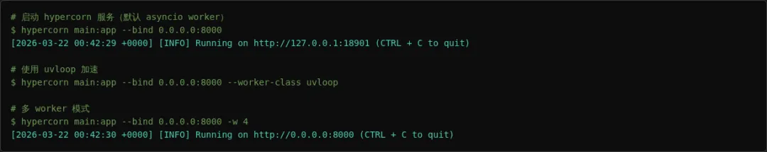 # 启动服务(默认 asyncio worker)hypercornmain:app--bind0.0.0.0:8000# 使用 uvloop 加速hypercornmain:app--bind0.0.0.0:8000--worker-classuvloop# 多 worker 模式hypercornmain:app--bind0.0.0.0:8000-w4
