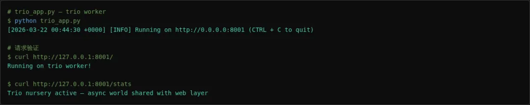 对于已经使用 trio 生态的项目(如某些异步科学计算任务),hypercorn 的 trio worker 可以让 Web 层和业务层共享同一个事件循环: