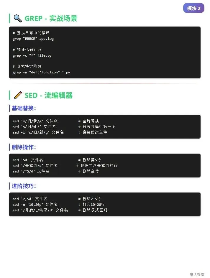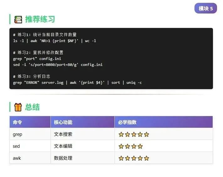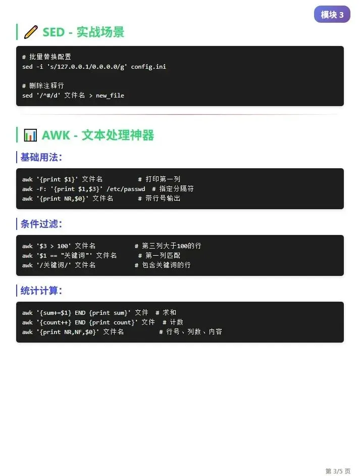 grep这是大海捞针的高手,sed是一位批改作业的老师,awk超强的算账不眨眼的会计。这三兄弟各怀绝技,合体更是无敌。刚入行那会儿,我对着日志文件只能手动翻,对着配置文件只能手动改,对着数据只能手动算。后来学会了这三剑客,才发现自己以前有多傻。今天就把它们介绍给你,保证让你相见恨晚。这三剑客,就是运维人的“效率三件套”。grep搜、sed改、awk算,一套下来,文件、日志、配置全搞定。