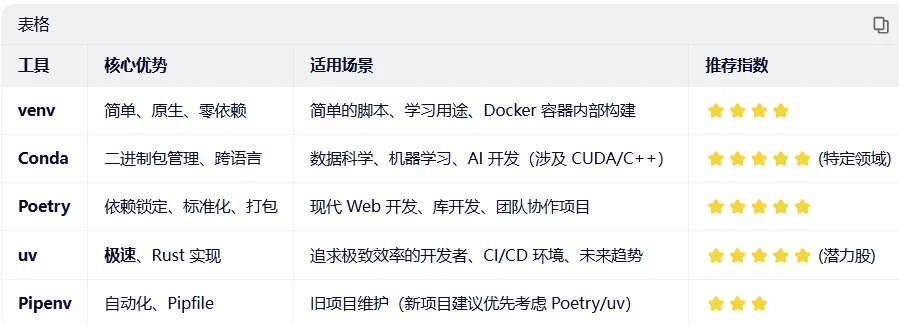 对于初学者,先用好内置的 venv 理解基本原理,再逐步过渡到更高级的工具。