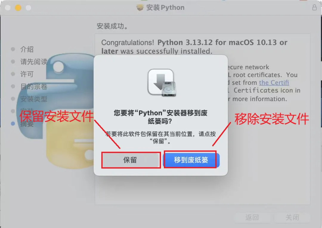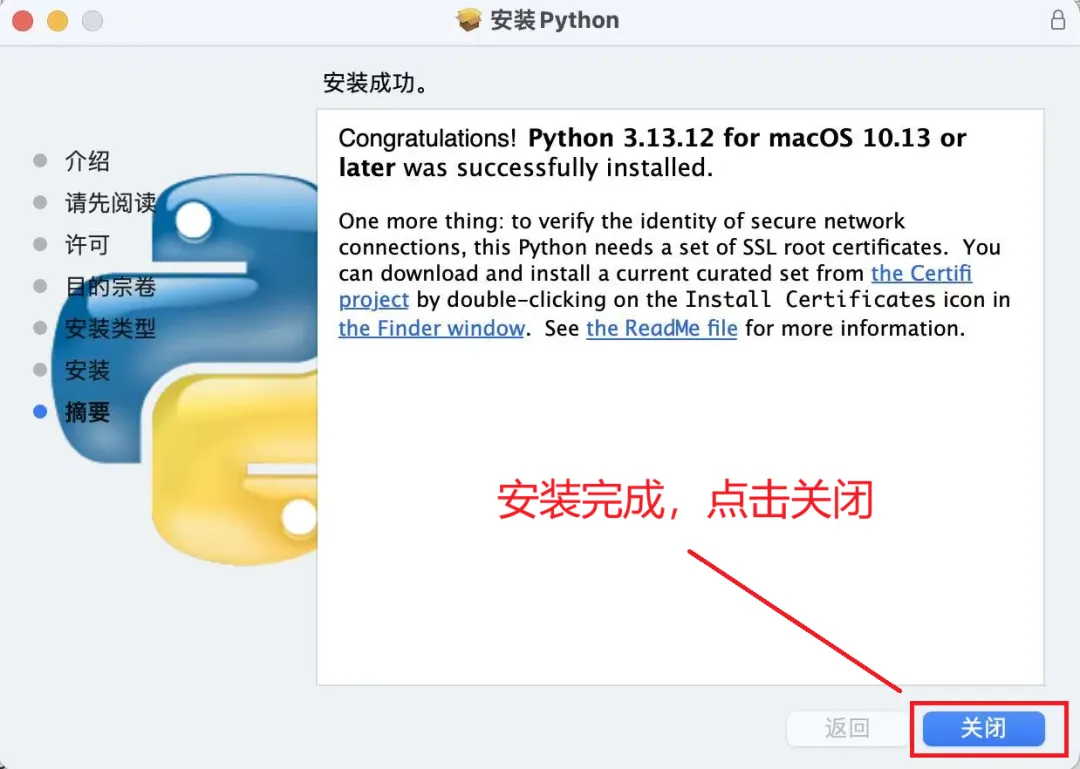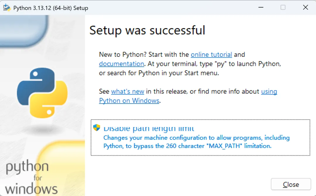 步骤 5:Python 安装完成后,您应该会看到“安装成功”窗口。
