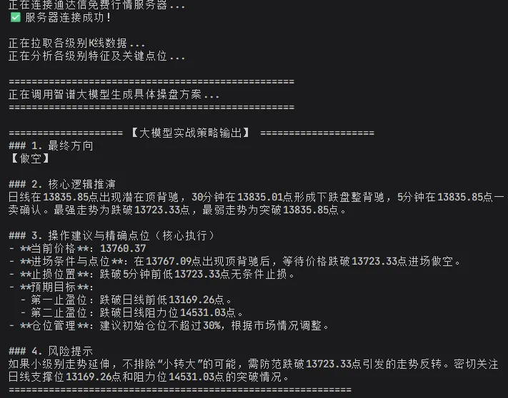 - “大脑”(AI决策): 将各级别状态喂给智谱大模型,通过精心设计的Prompt(提示词),让AI像一位老道操盘手一样,从战略到战术进行严格推理,最后给出操作建议。