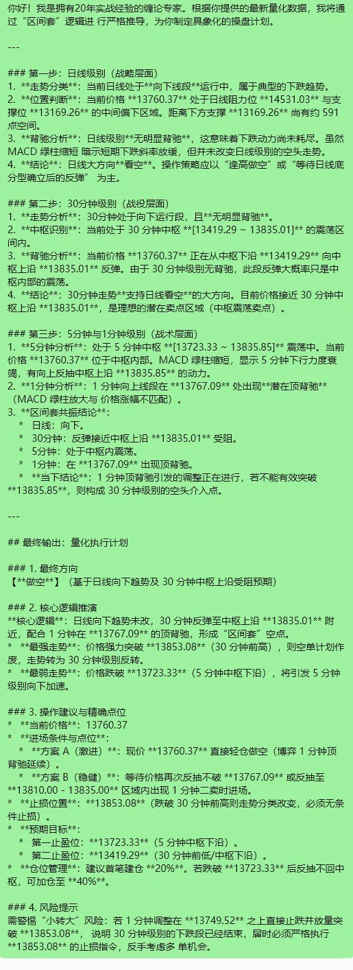 # ★ 核心铁律:点位具象化(极度重要)在制定交易计划时,绝对禁止只使用“前高”、“前低”、“中枢上沿”等抽象词汇。你必须从我上方提供的数据中提取**具体的数值(价格)**,并明确写在你的分析和操作计划中。所有的进场、止损、止盈必须是**精确到小数点的具体点位或价格区间**!## 分析步骤(请严格按此顺序进行“区间套”推理)### 第一步:日线级别(战略层面)1. 识别当前日线走势是“趋势”还是“盘整”。2. 根据提供的支撑阻力数值,判断日线当前处于什么位置。3. 日线级别是否出现背驰信号?(请结合具体价格数值说明)4. **结论**:日线大方向是看多、看空还是震荡?### 第二步:30分钟级别(战役层面)1. 基于日线的结论,分析30分钟走势。 - 若日线看多:30分钟是否在进行“下跌回调”? - 若日线看空:30分钟是否在进行“上涨反弹”?2. 结合提供的[ZD ~ ZG]区间数值,识别30分钟的中枢位置。3.30分钟级别是否出现背驰(趋势背驰或盘整背驰)?4. **结论**:30分钟是否支持日线的大方向?是否出现了买卖点雏形?### 第三步:5分钟与1分钟级别(战术层面)1. **5分钟**:在30分钟的潜在买卖点区域内,结合5分钟的中枢区间和高低点数值,走势是否出现背驰?2. **1分钟**:在5分钟背驰的基础上,1分钟走势是否出现精确的极值点?3. **结论**:当下是否处于“区间套”共振的精确买卖点?"""