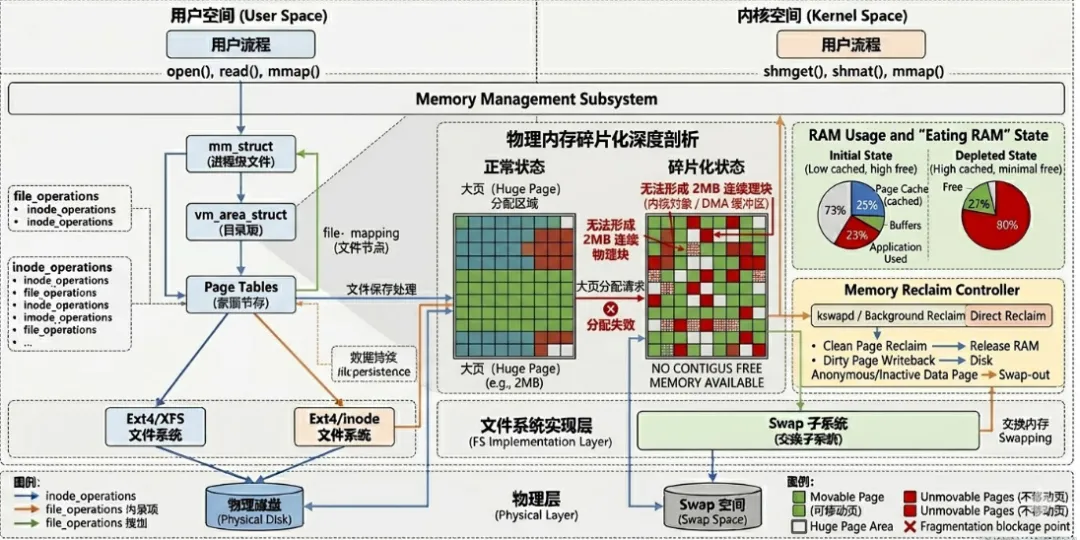 伙伴系统 merge 机制要求两个 buddy 块必须同时空闲、同阶、同迁移类型。现实中,不同子系统页的释放时间差异巨大,例如 slab 对象长期驻留,页缓存根据访问模式频繁变化,匿名页依赖进程行为,生命周期不一致。当这些页混杂于同一高阶块内时,释放事件几乎不可能同时发生,merge 条件长期无法满足。