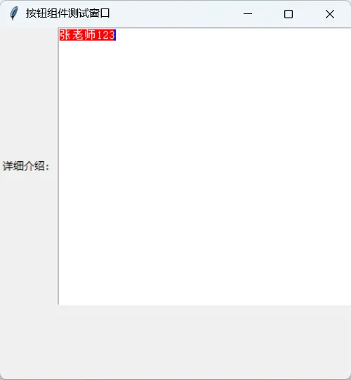 import tkinter as tk #以别名tk导入tkinter库win=tk.Tk() #创建主窗口的实例winwin.title("按钮组件测试窗口") #设置窗口的标题win.geometry("400x400+600+200")#设置窗口的大小和位置win.resizable(True,True) #设置窗口可水平缩放,禁止垂直缩放label1=tk.Label(win,text="详细介绍:") #创建标签对象label1label1.grid(row=0,column=0) #布局管理器grid,将组件添加到主窗口的第一行,第一列#其他属性效果和使用方法和前面几个组件相同,这里仅测试光标和选中属性text=tk.Text(win,selectbackground="red",insertbackground="blue") #创建文本框对象texttext.grid(row=0,column=1)tk.mainloop() #进入事件处理循环,防止窗口闪退