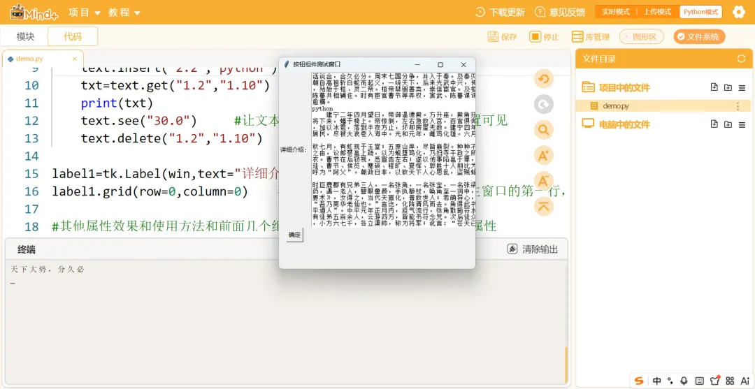 Text是Tkinter库中多行文本框组件,用来显示、编辑多行文字,支持样式、标签、滚动条,比Entry功能强很多。import tkinter as tk #以别名tk导入tkinter库win=tk.Tk() #创建主窗口的实例winwin.title("按钮组件测试窗口") #设置窗口的标题win.geometry("400x400+600+200")#设置窗口的大小和位置win.resizable(True,True) #设置窗口可水平缩放,禁止垂直缩放label1=tk.Label(win,text="详细介绍:") #创建标签对象label1label1.grid(row=0,column=0) #布局管理器grid,将组件添加到主窗口的第一行,第一列text=tk.Text(win) #创建文本框对象texttext.grid(row=0,column=1)tk.mainloop() #进入事件处理循环,防止窗口闪退