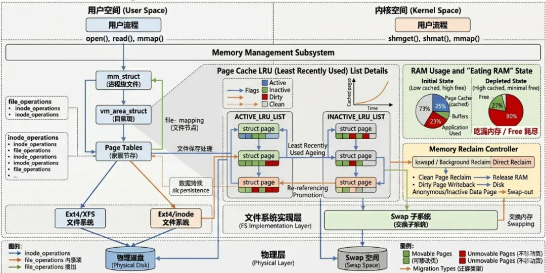 Page Cache 的存在使得 Linux 系统会出现“内存被吃满”的表象。实际上,Linux 内核将尽可能多的空闲内存用于缓存,这是内核设计理念中“惰性释放”的体现。通过这种机制,系统在内存紧张时会自动回收缓存页供应用使用,从而避免了内存不足。Page Cache 既缓存磁盘文件的内容,也缓存目录和元数据,通过映射 inode 与物理页形成页表映射。其管理涉及 LRU(最近最少使用)链表、Active/Inactive 队列,以及脏页(Dirty Page)的写回策略。