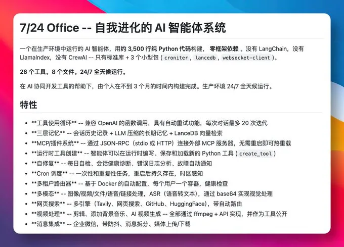 这两天看到一个挺有意思的开源项目,叫 724-office。它不走现在常见的 Agent 框架路线,反而有点“逆潮流”——整套系统只用了大约 3500 行纯 Python,零框架依赖,靠标准库加 3 个小包,就搭出了一个能持续运行的生产级 Agent 系统。