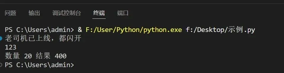 print("老司机已上线,都闪开")print(123)print("数量", 20, "结果", 400)跑出来就是效果: