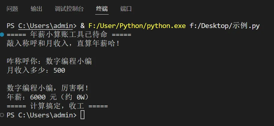 print("===== 年薪小算账工具已待命 =====")print("敲入称呼和月收入,直算年薪哈!\n")姓名 = input("咋称呼你:")月工资 = int(input("月收入多少:"))年薪 = 月工资 * 12print(f"\n{姓名},厉害啊!")print(f"年薪:{年薪} 元(约 {年薪//10000}W)")print("===== 计算搞定,收工 =====")跑出来是这效果: