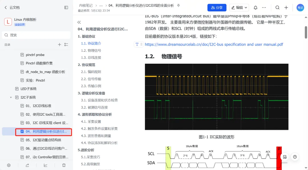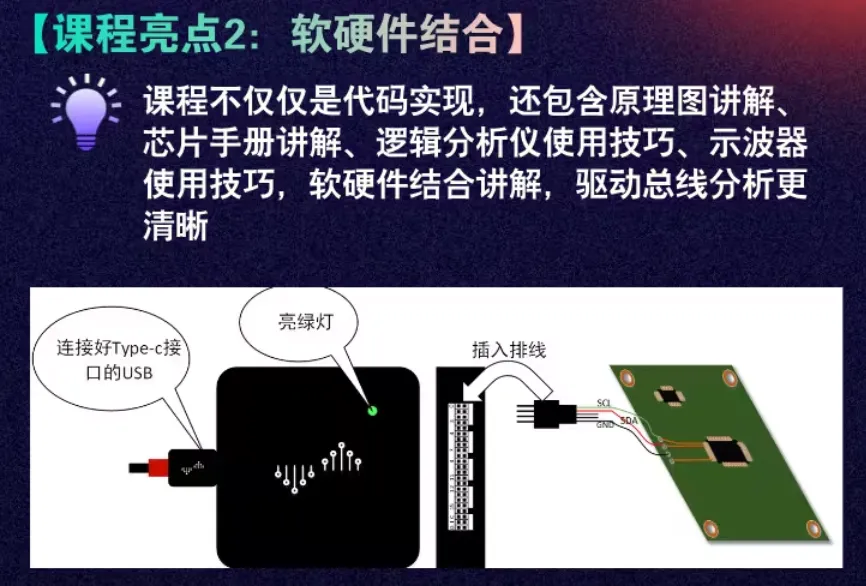 ① 用户态模拟:先用i2c-tools(如i2cset/i2cget)手动操作传感器,再对比内核驱动实现。 ② 协议分析:用逻辑分析仪抓取I2C波形,对照时序图分析START/STOP/ACK信号。