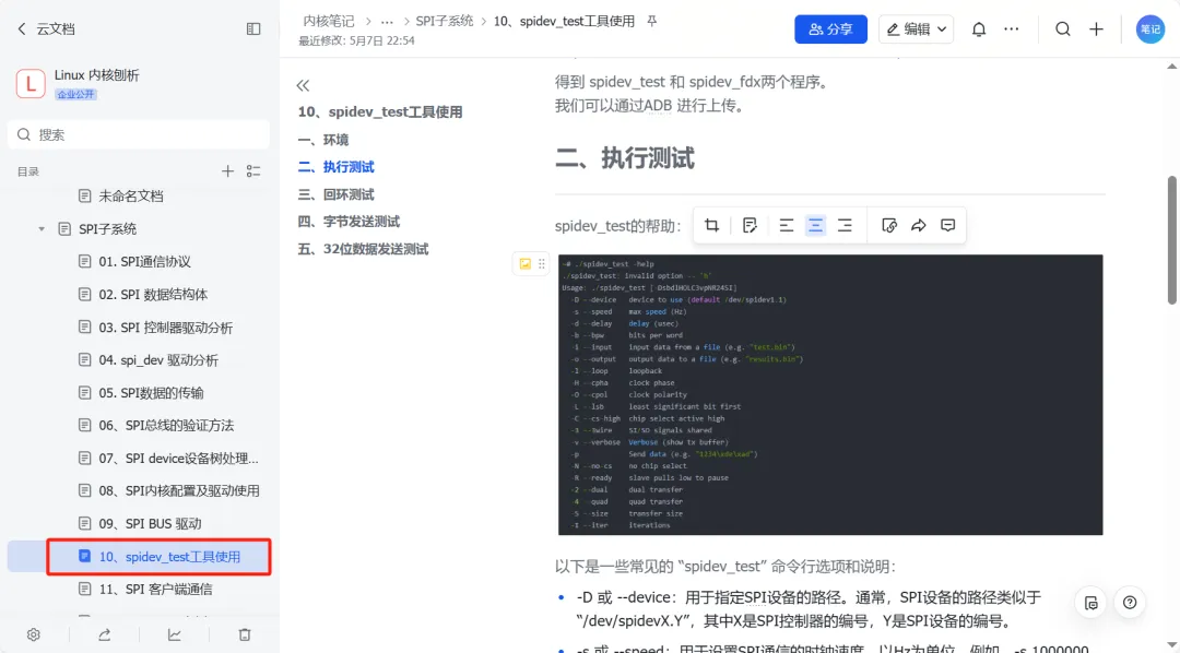 ① 全双工测试:实现SPI环回测试(MOSI接MISO),验证数据收发一致性。 ② 性能优化:对比spi_sync()和spi_async()的吞吐量差异(如传输1MB数据耗时)。