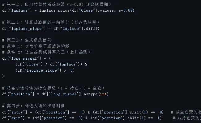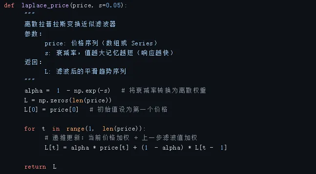 基于拉普拉斯变换的趋势交易策略,核心在于利用拉普拉斯趋势滤波器从价格序列中提取平滑、低延迟的趋势信号。相较于传统移动平均,该方法从连续时间信号处理理论出发,通过指数衰减加权实现更精准的趋势估计。实现步骤