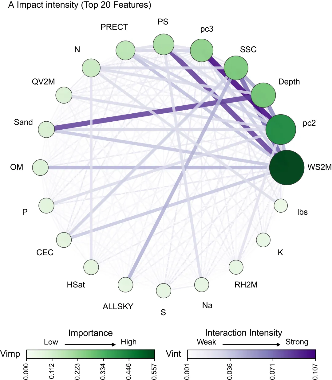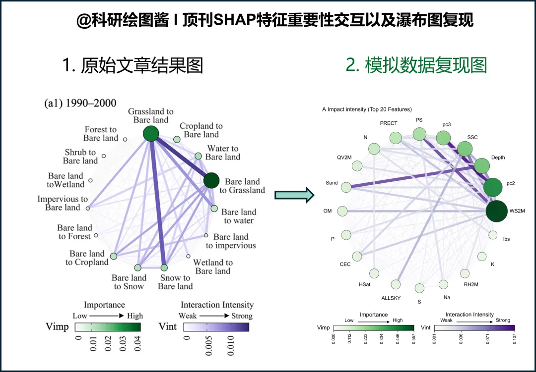 def plot_interaction(features,importance,interaction_matrix,top_n=None,node_size_min=220,node_size_max=2200,node_size_power=1.15,edge_width_weak_min=0.5,edge_width_weak_max=1.1,edge_width_strong_min=1.6,edge_width_strong_max=7.6,edge_highlight_percentile=85,edge_alpha=0.85,save_pdf_path=None,):# 如果指定了top_n,只选择最重要的特征if top_n is not None and top_n < len(features):# 先取前top_n,再按重要性从高到低排序,便于阅读sorted_indices = np.argsort(importance)[-top_n:][::-1]features = [features[i] for i in sorted_indices]importance = importance[sorted_indices]interaction_matrix = interaction_matrix[np.ix_(sorted_indices, sorted_indices)]cmap_nodes = current_color_scheme['nodes'] # 节点颜色映射cmap_edges = current_color_scheme['edges'] # 边颜色映射node_marker = current_style_scheme['marker'] # 节点的标记形状edge_linestyle = current_style_scheme['linestyle'] # 线条样式# 创建画布fig, ax = plt.subplots(figsize=(12, 10), subplot_kw={'aspect': 'equal'})n_features = len(features) # 特征总数量# 创建一个 NetworkX 图对象G = nx.Graph()G.add_nodes_from(features) # 向图中添加节点pos = nx.circular_layout(G) # 生成节点的环形布局坐标# 标签的坐标(向外偏移)label_pos = {k: (v[0] * 1.18, v[1] * 1.18) for k, v in pos.items()}# 归一化(真实值映射:Vimp/Vint 与“实际绘制边”一一对应)max_imp = float(np.max(importance)) if np.max(importance) > 0 else 1.0# 只统计将被绘制的边强度(上三角、非对角)pair_interactions = []for i in range(n_features):for j in range(i + 1, n_features):v = (interaction_matrix[i, j] + interaction_matrix[j, i]) / 2if v > 0:pair_interactions.append(v)pair_interactions = np.array(pair_interactions, dtype=float)if pair_interactions.size > 0:edge_vmin = float(np.min(pair_interactions))edge_vmax = float(np.max(pair_interactions))if edge_vmax <= edge_vmin:edge_vmax = edge_vmin + 1e-12else:edge_vmin, edge_vmax = 0.0, 1.0max_interaction = edge_vmaxnorm_nodes = mcolors.Normalize(vmin=0, vmax=max_imp)norm_edges = mcolors.Normalize(vmin=edge_vmin, vmax=edge_vmax)# 计算高强度边阈值(用于加粗高亮)edge_highlight_percentile = float(np.clip(edge_highlight_percentile, 0, 100))highlight_threshold = (np.percentile(pair_interactions, edge_highlight_percentile)if pair_interactions.size > 0 else 0)# 参数安全处理node_size_min = max(float(node_size_min), 1.0)node_size_max = max(float(node_size_max), node_size_min)node_size_power = max(float(node_size_power), 0.01)edge_width_weak_min = max(float(edge_width_weak_min), 0.01)edge_width_weak_max = max(float(edge_width_weak_max), edge_width_weak_min)edge_width_strong_min = max(float(edge_width_strong_min), 0.01)edge_width_strong_max = max(float(edge_width_strong_max), edge_width_strong_min)edge_alpha = float(np.clip(edge_alpha, 0, 1))# 节点颜色和大小node_colors = []node_sizes = []for i in range(n_features):node_colors.append(cmap_nodes(norm_nodes(importance[i])))# 节点大小可控:最小值 + 缩放范围 * (标准化重要性^指数)size = node_size_min + (node_size_max - node_size_min) * (importance[i] / max_imp) ** node_size_powernode_sizes.append(size)# 绘制所有弱交互边(浅色细线)weak_edges = []weak_edge_colors = []weak_edge_widths = []strong_edges = []strong_edge_colors = []strong_edge_widths = []##TODO:篇幅问题此处没有完全展示代码,需要定义节点循环# 绘制节点(实心绿、少量白心)nx.draw_networkx_nodes(G, pos, node_color=node_colors, node_size=node_sizes, ax=ax,alpha=0.98, node_shape=node_marker, linewidths=0.6, edgecolors='#2f2f2f')# 绘制节点标签nx.draw_networkx_labels(G, label_pos, font_size=11, font_weight='bold', ax=ax, font_family='serif')# 设置图形属性ax.axis('off')ax.set_xlim(-1.55, 1.55)ax.set_ylim(-1.65, 1.55)# 设置标题title_text = 'Impact intensity'if top_n is not None:title_text += f' (Top {top_n} Features)'plt.title(title_text, loc='left', fontsize=12, pad=14, fontfamily='Arial')# 颜色条与文字(紧贴网络图并缩小,匹配示例)sm_node = plt.cm.ScalarMappable(cmap=cmap_nodes, norm=norm_nodes)sm_node.set_array([])sm_edge = plt.cm.ScalarMappable(cmap=cmap_edges, norm=norm_edges)sm_edge.set_array([])# 节点重要性颜色条(更短、更近)cax_node = fig.add_axes([0.22, 0.115, 0.20, 0.016])cbar_node = plt.colorbar(sm_node, cax=cax_node, orientation='horizontal')cbar_node.set_ticks(np.linspace(0, max_imp, 6))cbar_node.ax.tick_params(labelsize=9, rotation=90, pad=2)cbar_node.outline.set_linewidth(0.8)# 交互强度颜色条(更短、更近)cax_edge = fig.add_axes([0.58, 0.115, 0.20, 0.016])cbar_edge = plt.colorbar(sm_edge, cax=cax_edge, orientation='horizontal')cbar_edge.set_ticks(np.linspace(edge_vmin, max_interaction, 4))cbar_edge.ax.tick_params(labelsize=9, rotation=90, pad=2)cbar_edge.outline.set_linewidth(0.8)# 添加色带标题与箭头文字(按示例:两段词 + 实线箭头)ax.text(0.32, 0.147, 'Importance', transform=fig.transFigure,ha='center', va='bottom', fontsize=12, fontfamily='Arial')ax.text(0.273, 0.131, 'Low', transform=fig.transFigure,ha='right', va='bottom', fontsize=10.5, fontfamily='serif')ax.text(0.367, 0.131, 'High', transform=fig.transFigure,ha='left', va='bottom', fontsize=10.5, fontfamily='serif')ax.annotate('', xy=(0.362, 0.134), xytext=(0.278, 0.134),xycoords=fig.transFigure, textcoords=fig.transFigure,arrowprops=dict(arrowstyle='-|>', lw=1.0, color='black', mutation_scale=10))ax.text(0.215, 0.123, 'Vimp', transform=fig.transFigure,ha='right', va='center', fontsize=12, fontfamily='serif')ax.text(0.68, 0.147, 'Interaction Intensity', transform=fig.transFigure,ha='center', va='bottom', fontsize=12, fontfamily='serif')ax.text(0.628, 0.131, 'Weak', transform=fig.transFigure,ha='right', va='bottom', fontsize=10.5, fontfamily='serif')ax.text(0.733, 0.131, 'Strong', transform=fig.transFigure,ha='left', va='bottom', fontsize=10.5, fontfamily='serif')ax.annotate('', xy=(0.728, 0.134), xytext=(0.633, 0.134),xycoords=fi