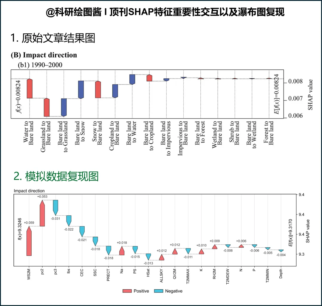 def plot_waterfall(features, shap_values, expected_value,current_color_scheme, top_n=15,save_pdf_path=None,show_contribution_labels=True,contribution_label_fmt='{:+.3f}',contribution_label_fontsize=9):mean_shap = np.mean(shap_values, axis=0)sorted_indices = np.argsort(np.abs(mean_shap))[::-1][:top_n]sorted_features = [features[i] for i in sorted_indices]shap_vals = mean_shap[sorted_indices]if isinstance(expected_value, (list, np.ndarray)):base_value = float(np.array(expected_value).flatten()[0])else:base_value = float(expected_value)starts, ends = [], []y_curr = base_valuefor v in shap_vals:starts.append(y_curr)y_curr += vends.append(y_curr)final_value = y_currpos_color = '#f1696d'neg_color = '#44c3df'fig, ax = plt.subplots(figsize=(13.8, 6.25), dpi=140)fig.patch.set_facecolor('white')ax.set_facecolor('white')x = np.arange(len(sorted_features))y_all = [base_value] + starts + endsy_range = max(np.max(y_all) - np.min(y_all), 1e-6)bar_w = 0.36tip_h = 0.085 * y_range # 箭头尖高度(全局基准)## TODO: 篇幅原因,代码没有展示完整,此处需要定义循环展示每个特征的贡献值# 竖向参考线for xi in x:ax.axvline(xi, color='#9a9a9a', linestyle='-', linewidth=0.55, alpha=0.4, zorder=1)y_min, y_max = min(y_all), max(y_all)y_span = (y_max - y_min) if y_max > y_min else 1.0pad = 0.10 * y_span# 预留额外上下空间,确保两侧文本框始终在坐标轴内部ax.set_ylim(y_min - pad, y_max + pad)y_low, y_high = ax.get_ylim()margin = 0.08 * (y_high - y_low)# 左右说明框:固定纵向居中(不随数据上下漂移)center_y = (y_low + y_high) / 2.0fx_y = center_yex_y = center_yax.set_xticks(x)ax.set_xticklabels(sorted_features, rotation=90, fontsize=10, fontfamily='Arial')# 取消左边框刻度(主轴左侧不显示任何刻度线/标签)ax.tick_params(axis='y', which='both', left=False, labelleft=False, length=0)ax.set_ylabel('')ax_right = ax.twinx()ax_right.set_ylim(ax.get_ylim())ax_right.set_ylabel('SHAP value', fontsize=13, fontfamily='Arial')ax_right.tick_params(axis='y', labelsize=11)ax_right.yaxis.set_major_locator(plt.MaxNLocator(4))ax_right.yaxis.set_major_formatter(plt.FormatStrFormatter('%.1f'))for side in ['left', 'right', 'top', 'bottom']:ax.spines[side].set_linewidth(1.2)ax.spines[side].set_color('#2f2f2f')for sp in ax_right.spines.values():sp.set_visible(False)# 左右竖排框注:放在边框外,且始终纵向居中x_left, x_right = ax.get_xlim()x_span = x_right - x_leftex_x = x_left - 0.035 * x_spanfx_x = x_right - 0.020 * x_spanbox_kw = dict(facecolor='white', edgecolor='#4a4a4a', boxstyle='square,pad=0.25')ax.text(ex_x, ex_y, f'E[f(x)]={base_value:.4f}',rotation=90, va='center', ha='center', fontsize=12, fontfamily='Arial',bbox=box_kw, clip_on=False)ax.text(fx_x, fx_y, f'f(x)={final_value:.4f}',rotation=90, va='center', ha='center', fontsize=12, fontfamily='Arial',bbox=box_kw, clip_on=True)ax.set_title('Impact direction', loc='left', fontsize=20, fontfamily='Arial', pad=4)legend_elements = [patches.Patch(facecolor=pos_color, edgecolor='#2f2f2f', label='Positive'),patches.Patch(facecolor=neg_color, edgecolor='#2f2f2f', label='Negative')]legend_y = -0.46label_fs = 16# 先放“Impact direction”文字,再让图例紧跟其后,保证三者同一水平线且字号一致impact_x = 0.42ax.legend(handles=legend_elements,ncol=2,loc='upper left',bbox_to_anchor=(impact_x + 0.01, legend_y),frameon=False,fontsize=label_fs,columnspacing=1.2,handletextpad=0.5,borderaxespad=0.0,prop={'family': 'Arial'})plt.subplots_adjust(bottom=0.44, left=0.10, right=0.88, top=0.88)if save_pdf_path is not None:fig.savefig(save_pdf_path, format='pdf', bbox_inches='tight')plt.show()return fig, ax