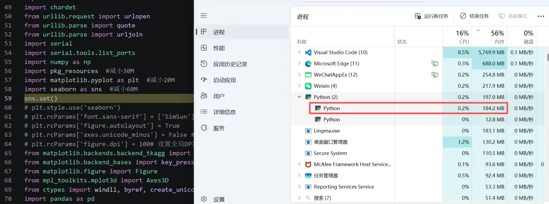 统计所有的模块和代码行,对其进行优化,去除不必要的模块,比如下图中导入的模块,占用了近100M。