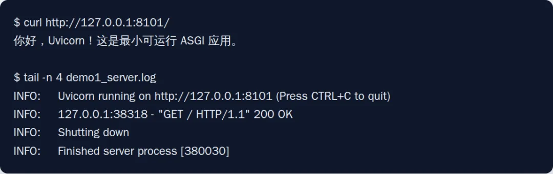 # demo1_app.pyasyncdefapp(scope,receive,send):assertscope['type']=='http'body='你好,Uvicorn!这是最小可运行 ASGI 应用。\n'.encode('utf-8')awaitsend({'type':'http.response.start','status':200,'headers':[(b'content-type',b'text/plain; charset=utf-8')],})awaitsend({'type':'http.response.body','body':body})