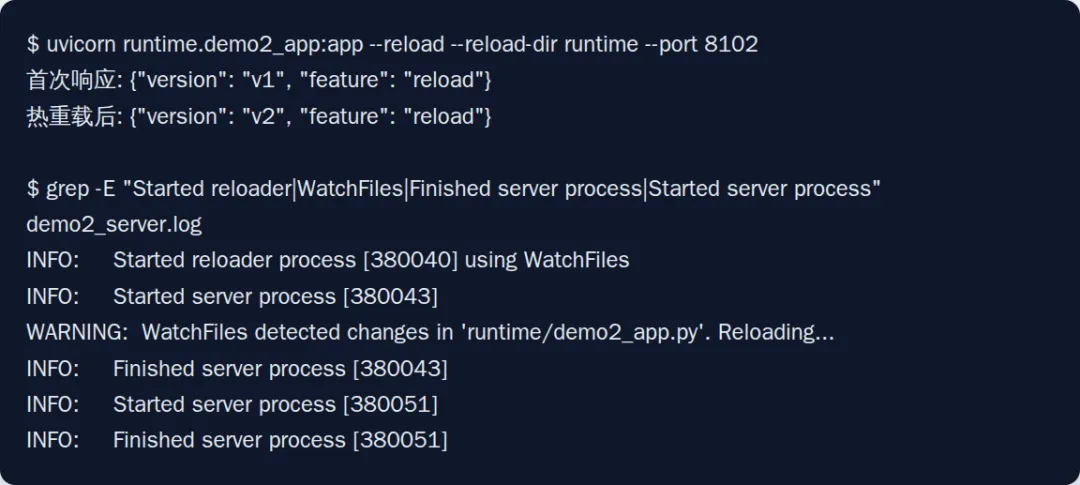 从实测结果可以看到,第一次响应还是 v1,修改文件后,WatchFiles 触发重载,再次请求已经切到 v2。这说明 uvicorn 的开发体验并不只是“能跑”,而是能把改动反馈闭环压到很短。