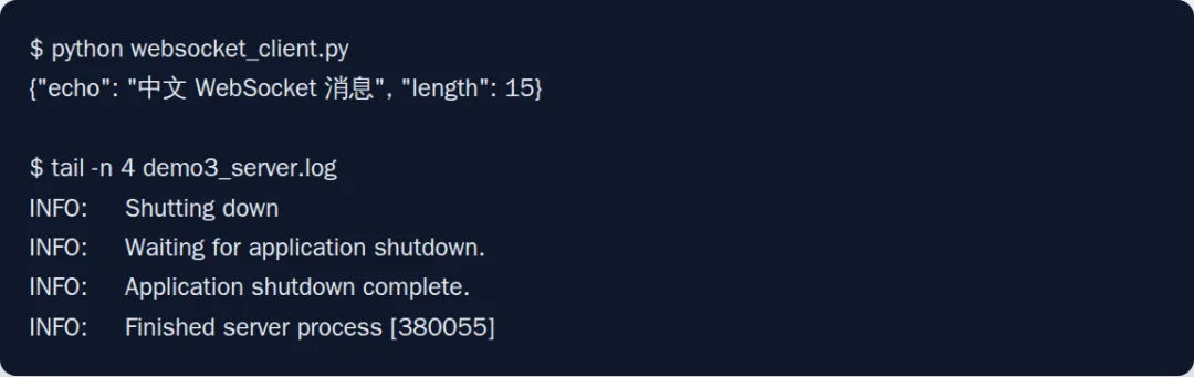 这段代码解决什么问题:如果你需要聊天、推送、终端桥接、协作编辑这类长连接场景,HTTP 请求/响应模型就不够用了。uvicorn 能直接承载 ASGI WebSocket 应用,不用额外换服务器。