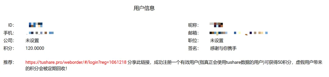 注:小编在这插入这个链接是因为官方注明推荐一个用户赠送50积分(https://tushare.pro/weborder/#/login?reg=1061218)