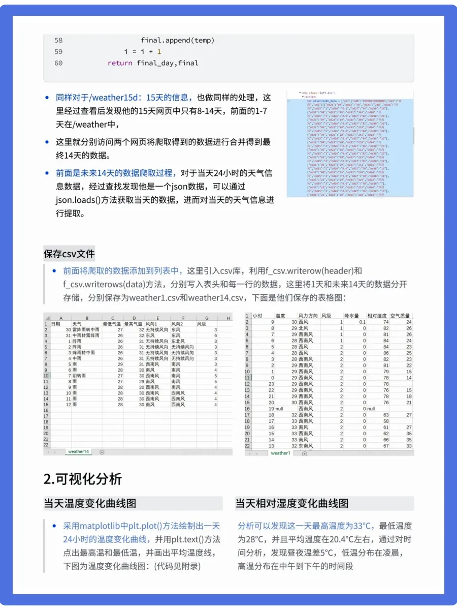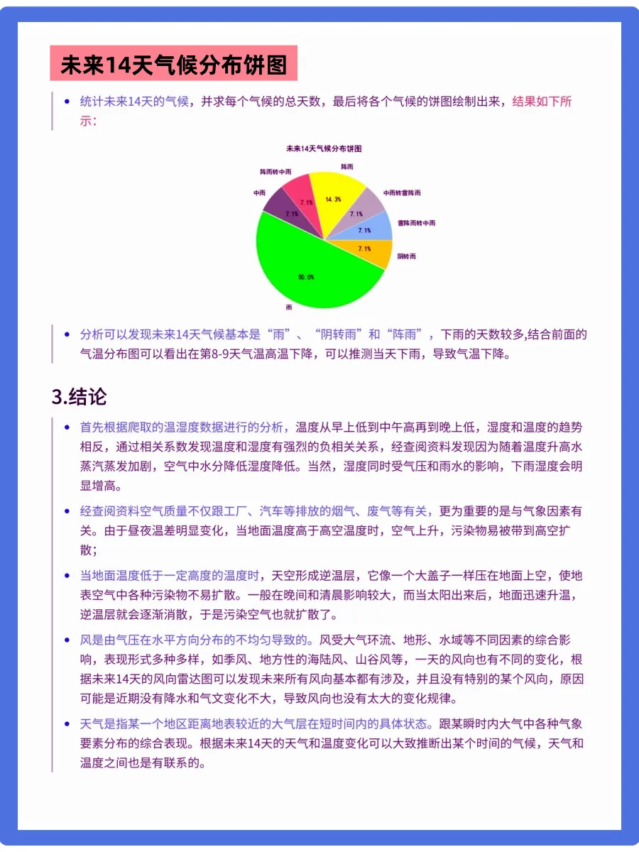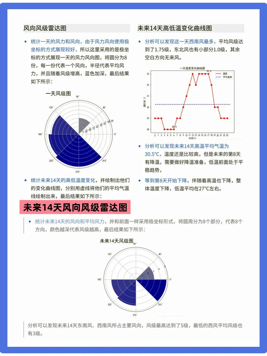 天气预报想必都不陌生,我们可以根据未来的天气增减衣物、安排出行,每天的气温、风速风向、相对湿度、空气质量等成为关注的焦点。今天要分享的是使用python中requests和BeautifulSoup库对中国天气网当天和未来14天的数据进行爬取,保存为csv文件,之后用matplotlib、numpy、pandas对数据进行可视化处理和分析,得到温湿度度变化曲线、空气质量图、风向雷达图等结果,为获得未来天气信息提供了有效方法。相对应的视频教程、课件源码、学习笔记,已打包好📦,有需要可关一下,厚台发“111”即可拿走!会手把手带你学技术,上手实操!