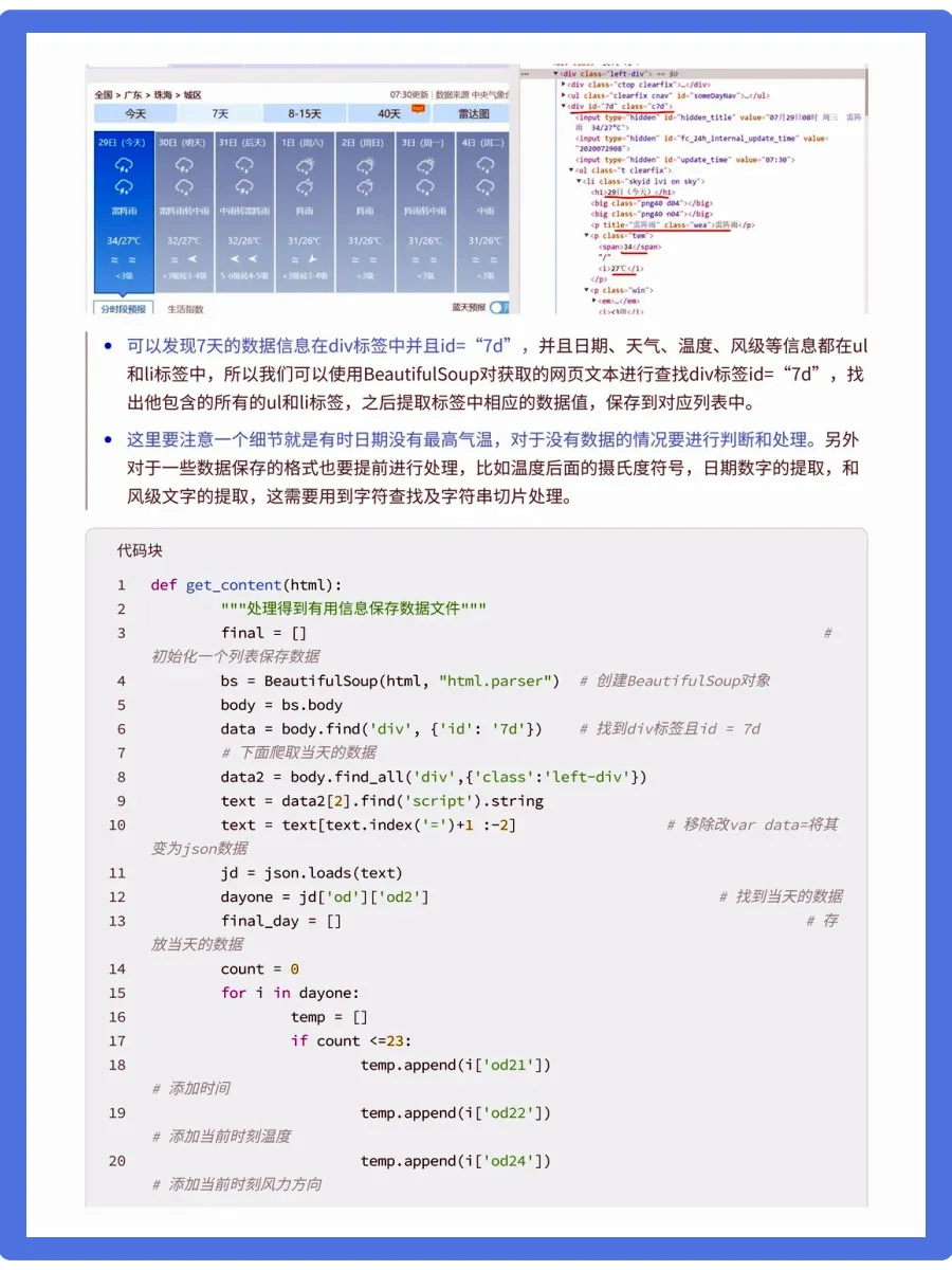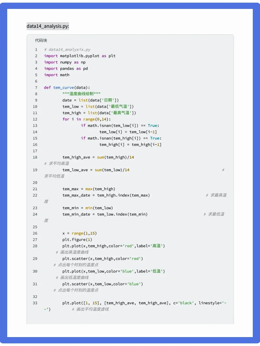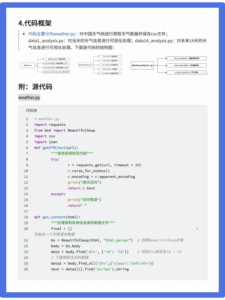 天气预报想必都不陌生,我们可以根据未来的天气增减衣物、安排出行,每天的气温、风速风向、相对湿度、空气质量等成为关注的焦点。今天要分享的是使用python中requests和BeautifulSoup库对中国天气网当天和未来14天的数据进行爬取,保存为csv文件,之后用matplotlib、numpy、pandas对数据进行可视化处理和分析,得到温湿度度变化曲线、空气质量图、风向雷达图等结果,为获得未来天气信息提供了有效方法。相对应的视频教程、课件源码、学习笔记,已打包好📦,有需要可关一下,厚台发“111”即可拿走!会手把手带你学技术,上手实操!