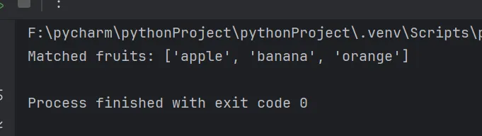 import retext = "I like apple, banana, and orange. I also enjoy grapes."# 正则表达式匹配 "apple"、"banana" 或 "orange"pattern = r"apple|banana|orange"# 查找所有匹配项matches = re.findall(pattern, text)# 输出结果print("Matched fruits:", matches)
