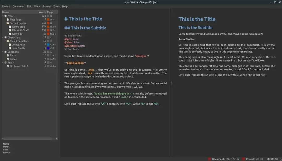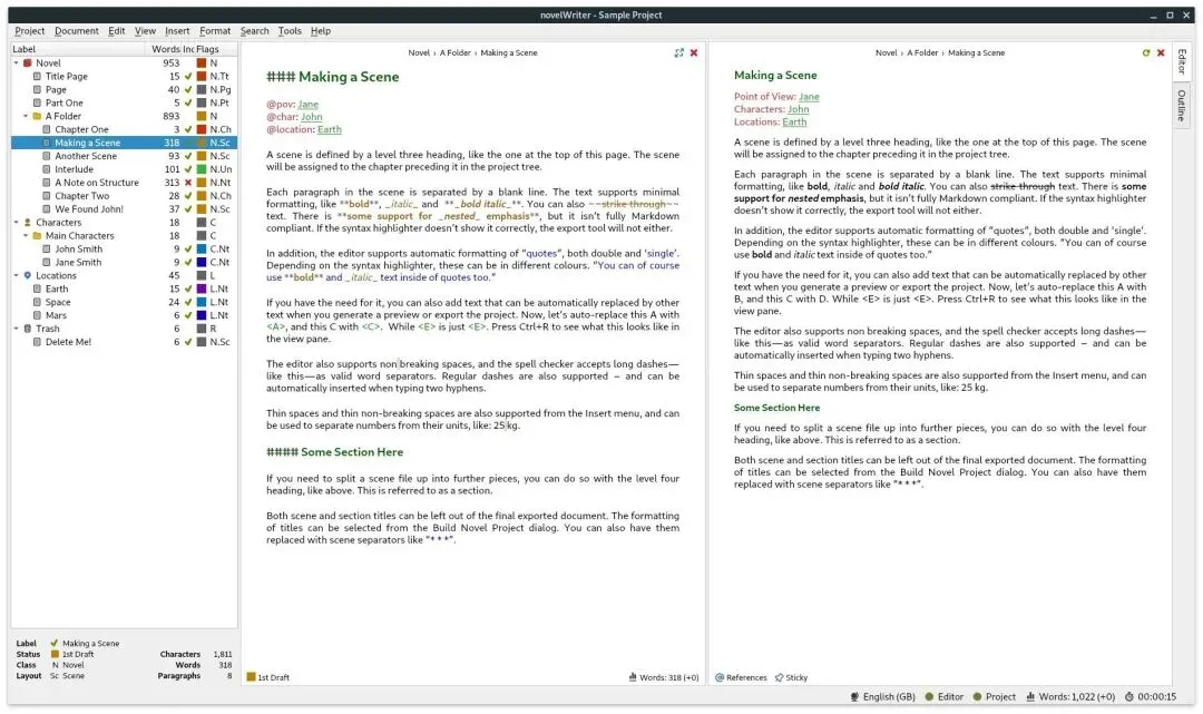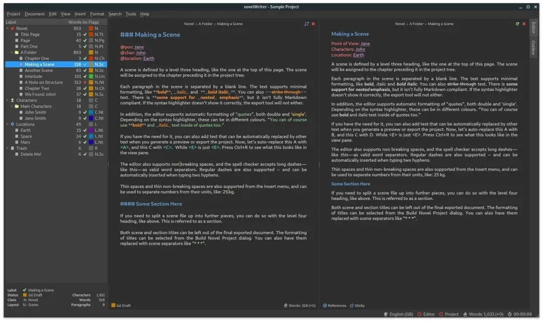 同时,novelWriter支持类似Markdown的简洁语法,让用户专注于写作本身,无需被复杂的格式设置干扰。