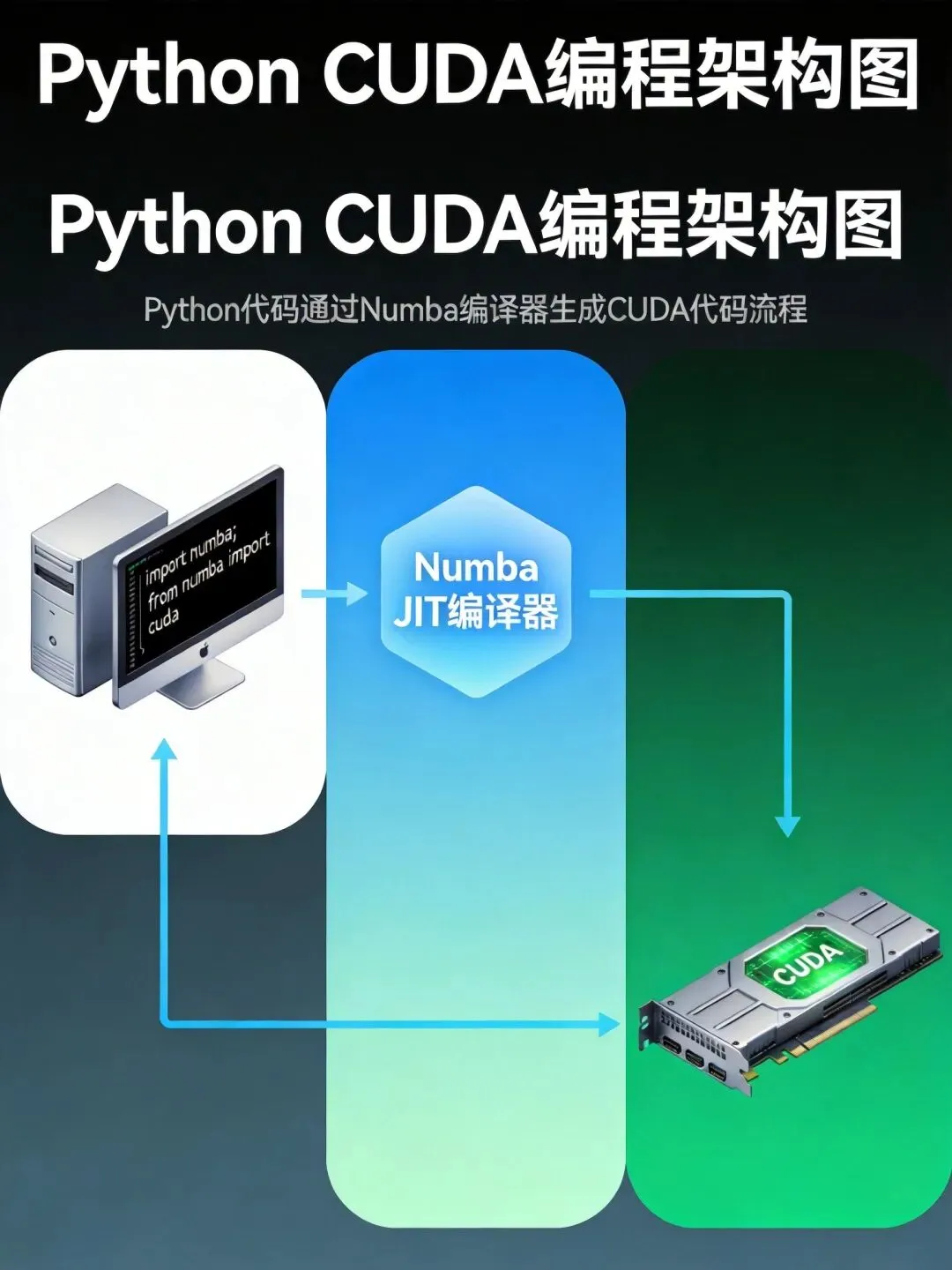 Numba是Anaconda公司开发的Python即时编译器,其CUDA模块为Python开发者提供了简洁而强大的GPU编程接口。相比直接编写CUDA C++代码,Numba的优势在于: