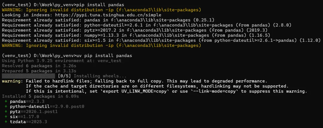 uv venv 替代 python -m venv,uv pip 替代 pip,语法完全兼容且速度大幅提升;