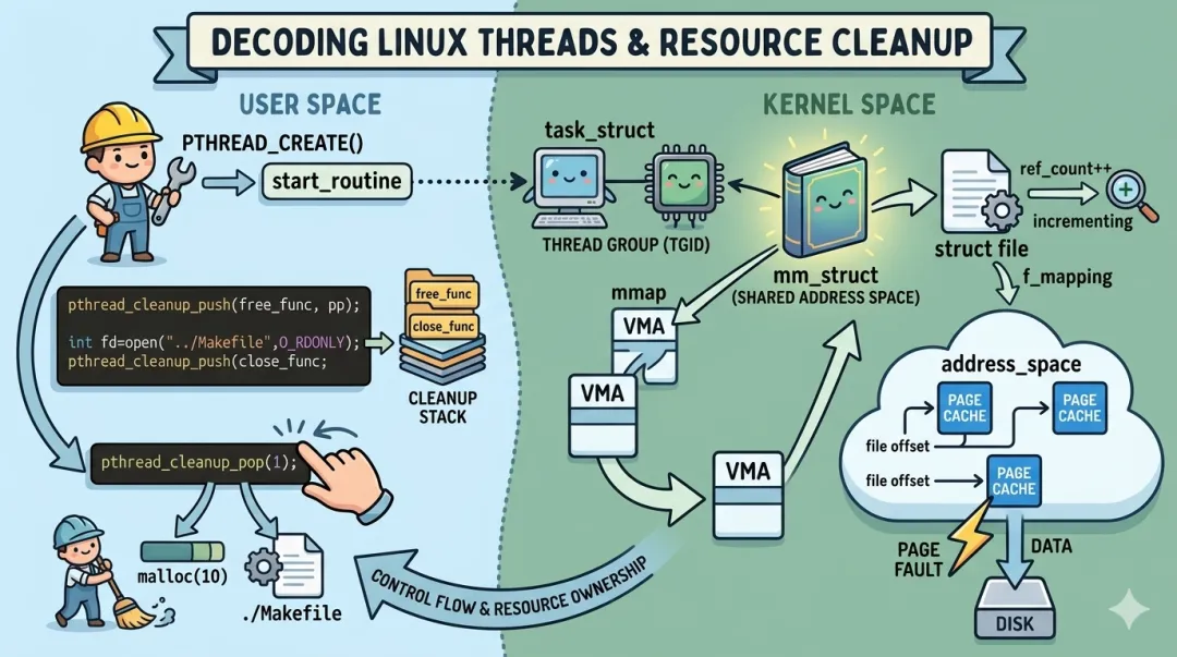 执行流(Thread/Task)是暂时的,而资源(VMA/Inode/Page Cache)是持久的。 作为开发者,我们要利用 pthread_cleanup 来确保执行流在消亡前履行其对资源的“打扫”义务。一个健壮的并发程序,不仅要关注正常路径的逻辑,更要明确资源在 task 消亡时的去向。