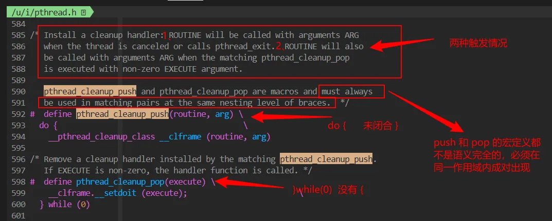 pthread_cleanup_push/pop 用于处理线程异常路径上的资源释放。在 glibc 中,这对接口是宏而非普通函数。
