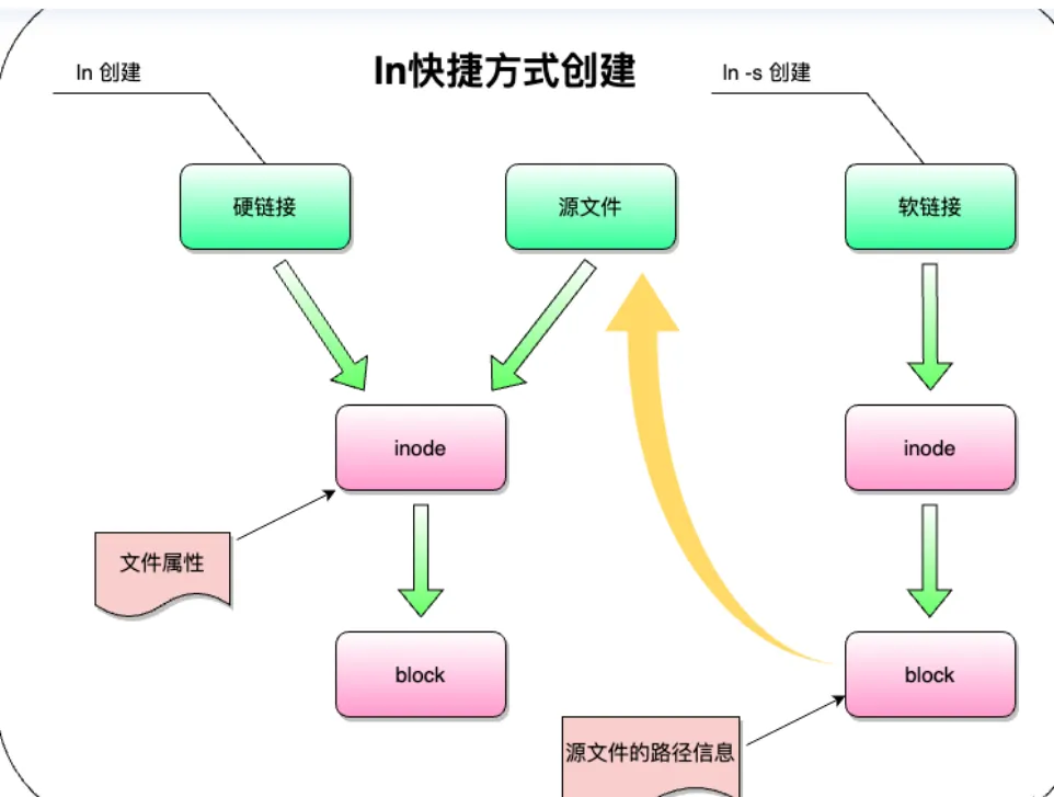 - • 软链接是路径的指针,独立的 Inode,删了源文件就失效,灵活好用,能跨分区能链目录。