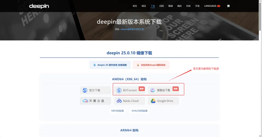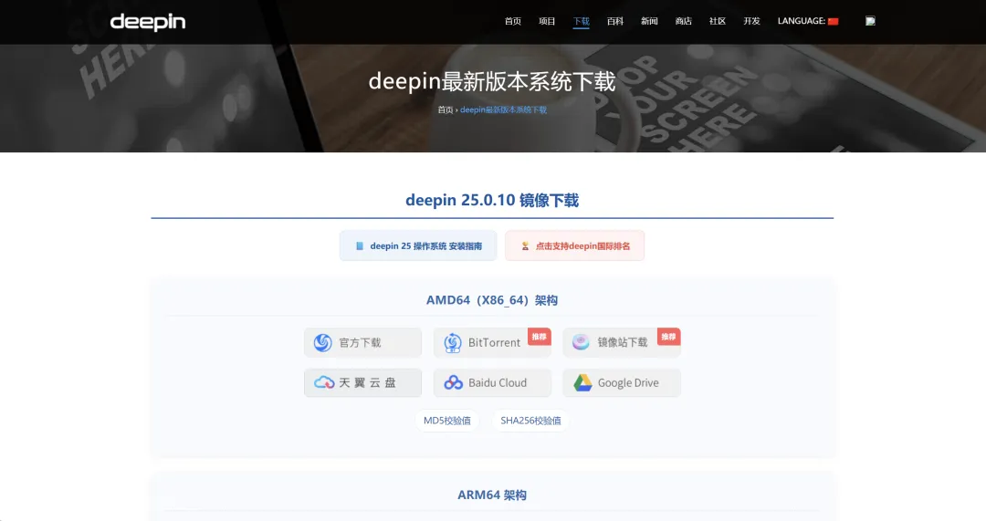 从此页面可知, Deepin 支持多种 CPU 架构,如:AMD64(即常说的X86_64)、ARM64、Loogn64架构(国产芯片代表架构)等。当然,本人的电脑是AMD64架构,所以应点击“AMD64(X86_64)架构”下的任意镜像源进行下载: