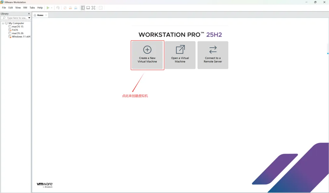 在虚拟机主页面点击“Create a New Virtual Machine”来进行创建虚拟机: