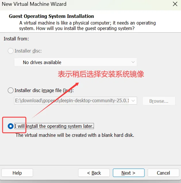 这里选稍后进行配置即可。接着点击“Next”开始配置系统类型。这里选择 “Linux” 和 “Debian 13.X 64 bit”: