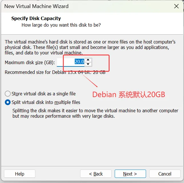 接着点击“Next” 开始配置磁盘选项。对于 Debian 系统而言,默认会分配20GB: