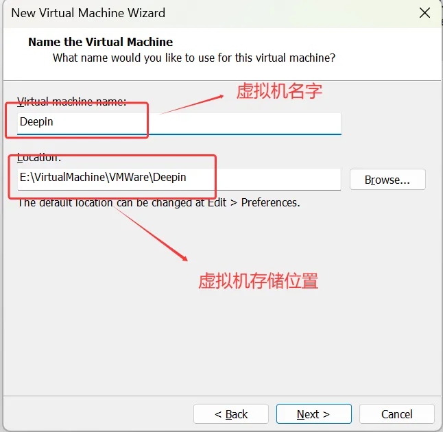 接着点击“Next” 开始配置虚拟机名字和相关文件的存储位置。默认会存储于 C 盘。但因本人非首次安装,故会自动选上次设置的存储目录: