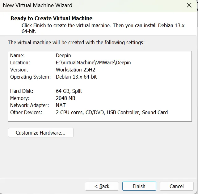 其实 Deepin 系统本质是 Debian 的扩展,因此需创建 Debian 类型的虚拟机。