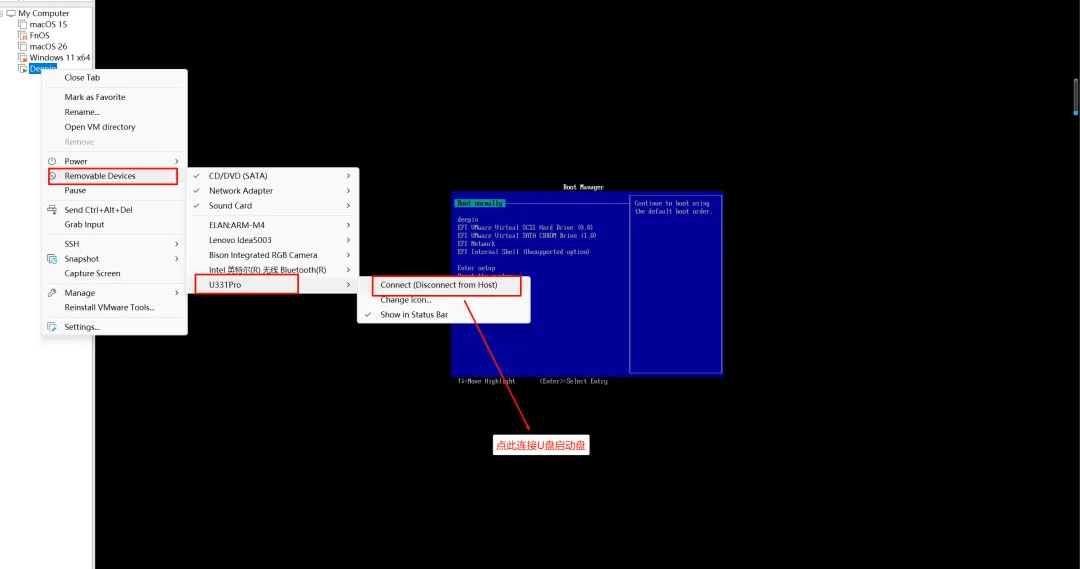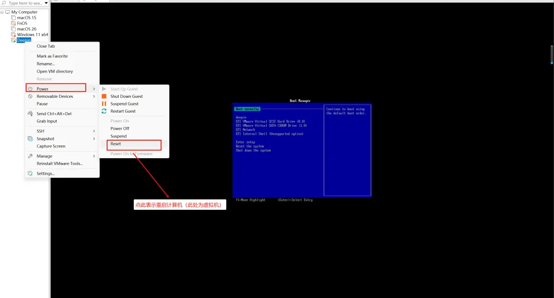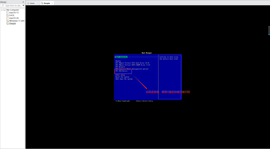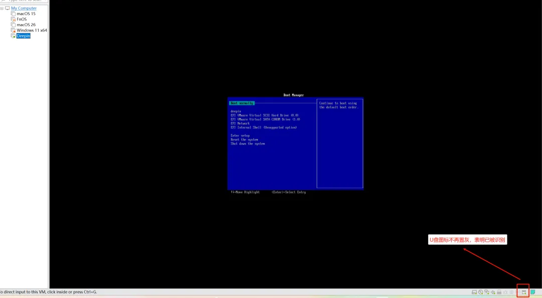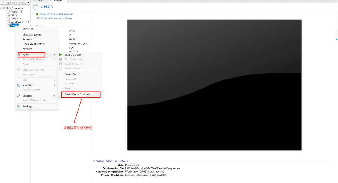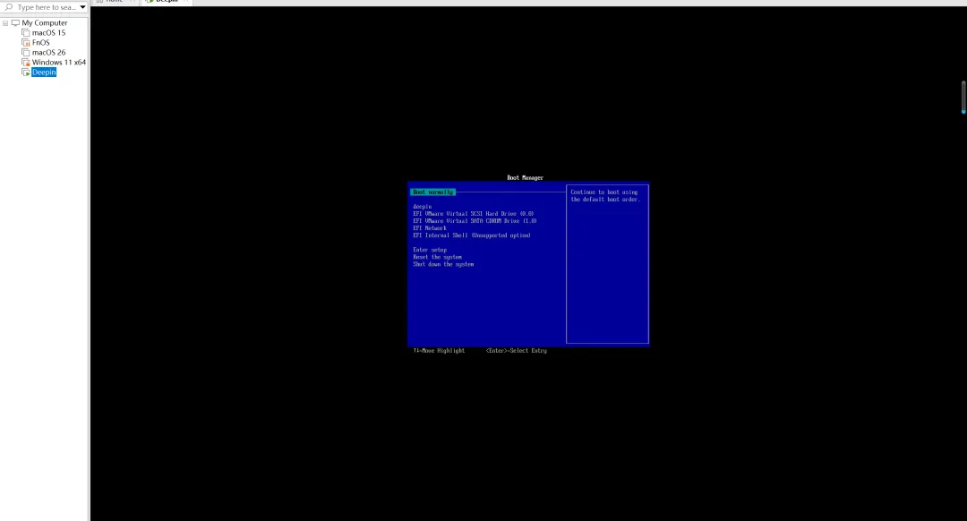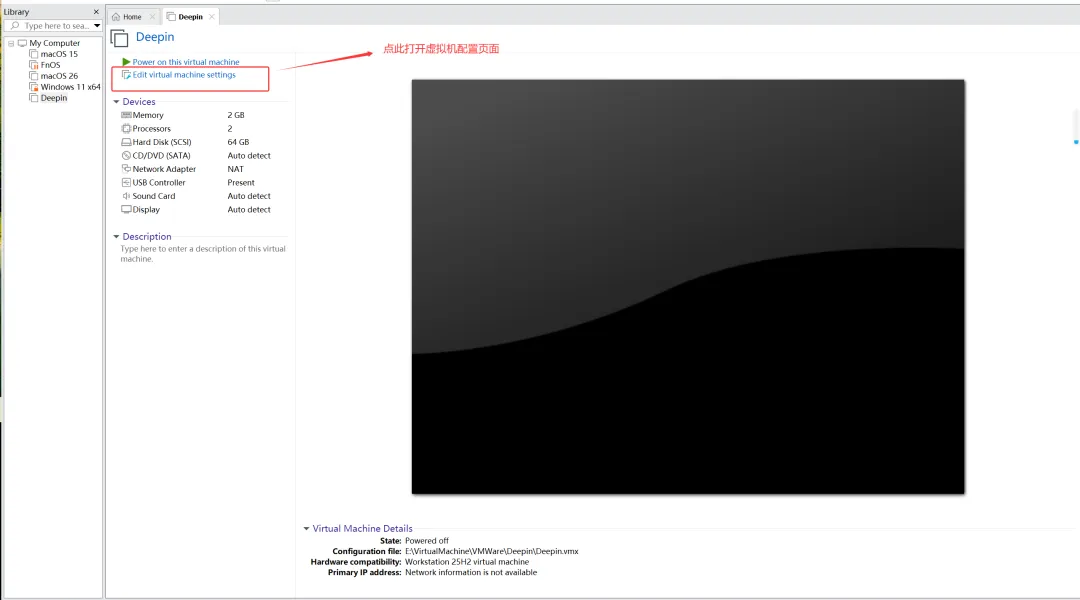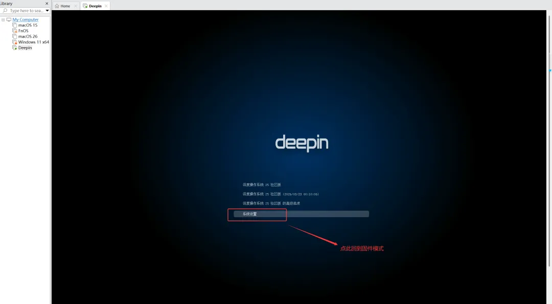 不过,此时还需做一些简单修改,即将引导方式改为 EFI 模式。此时点击 Deepin 虚拟机的“Edit virtual machine settings”来打开虚拟机配置页面: