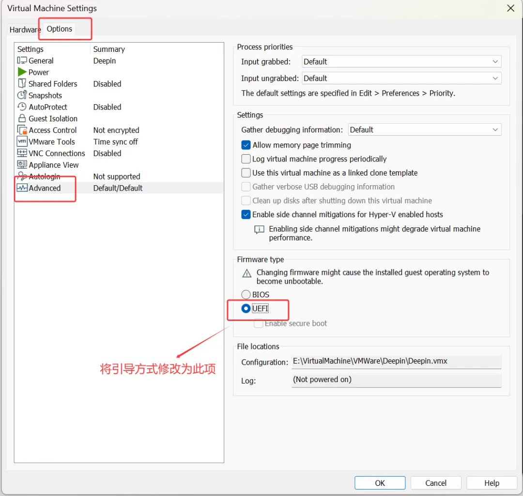 打开配置页面后,点击“Options” > “Advanced” 后,将 Firmware Type (固件类型)改为 UEFI: