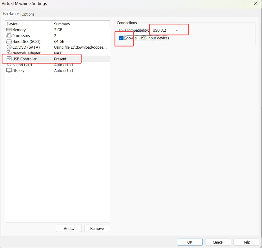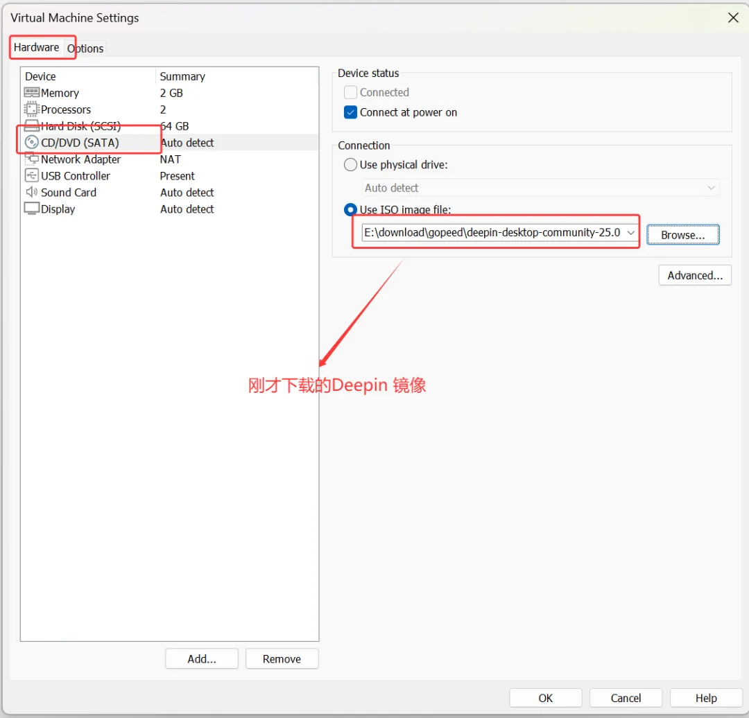 接着切换回 Hardware 后,点击“Hardware” > “CD/DVD(SATA)”后,在 Use ISO Image file 中选刚才下载的 Deepin 镜像: