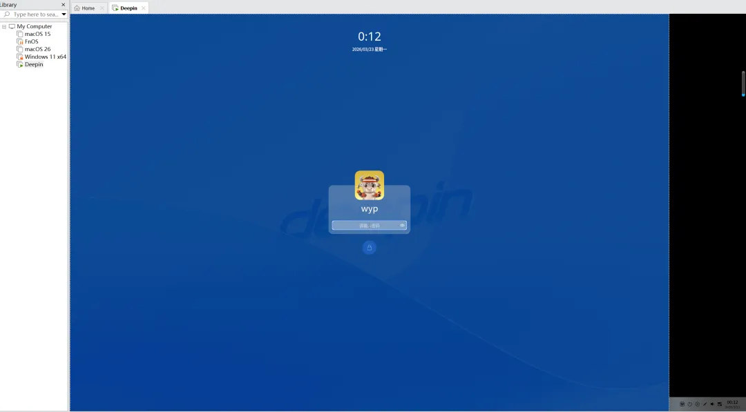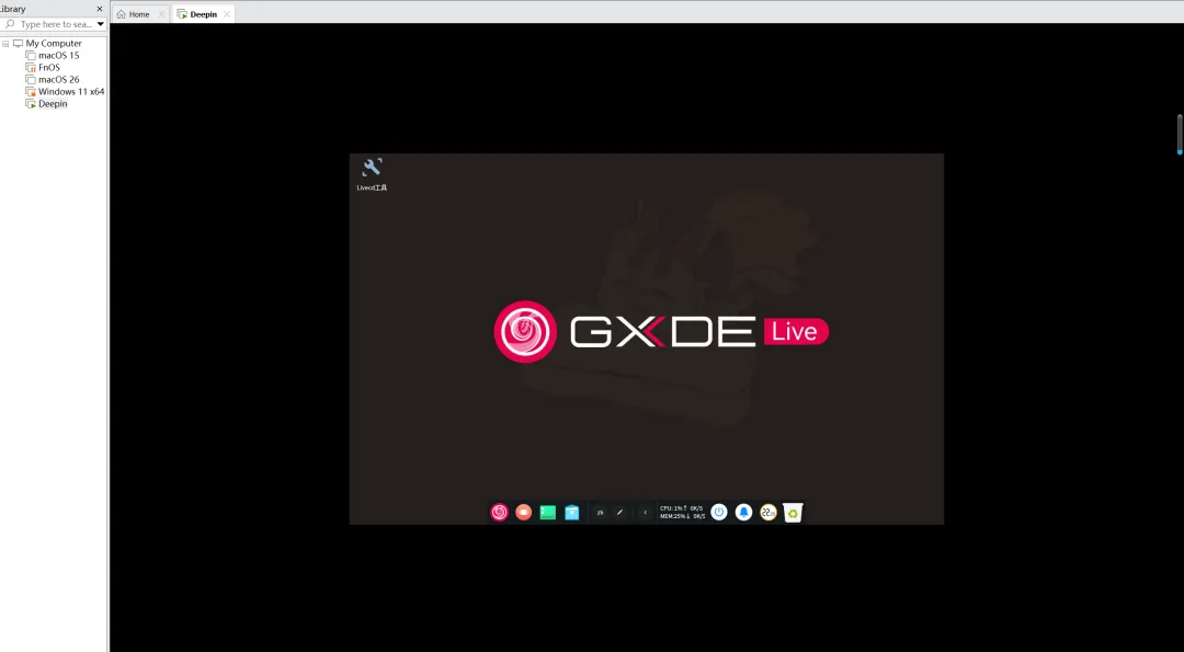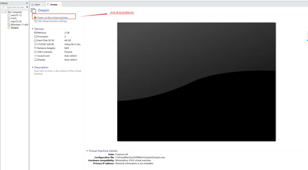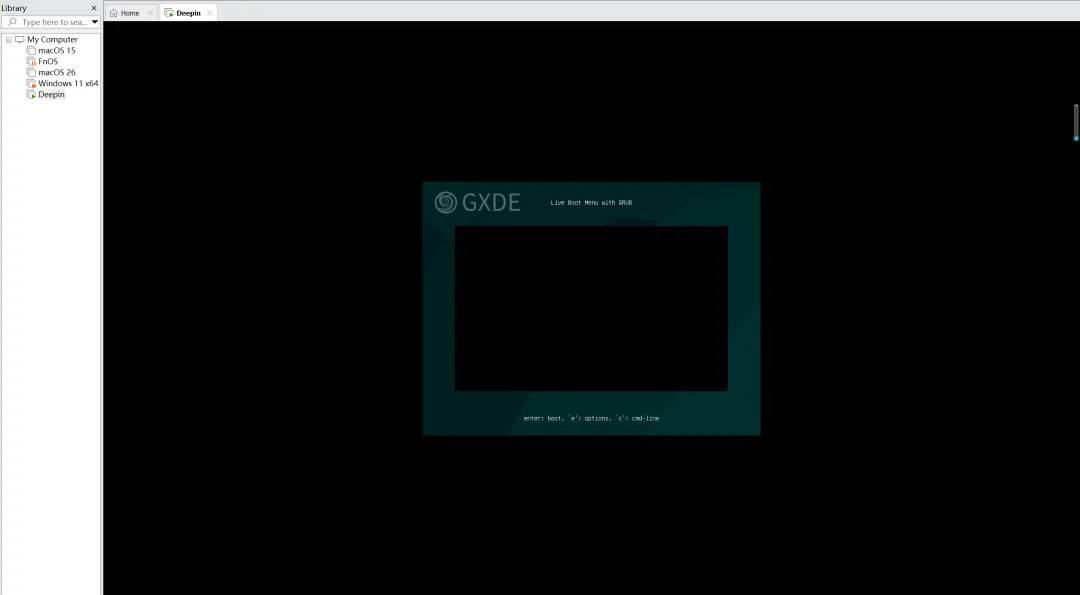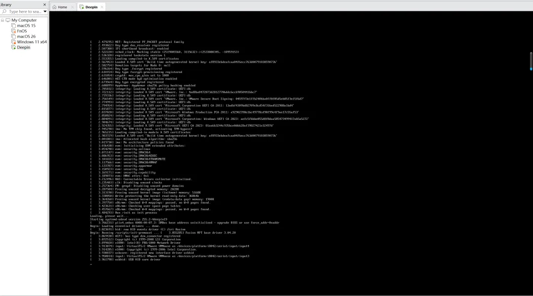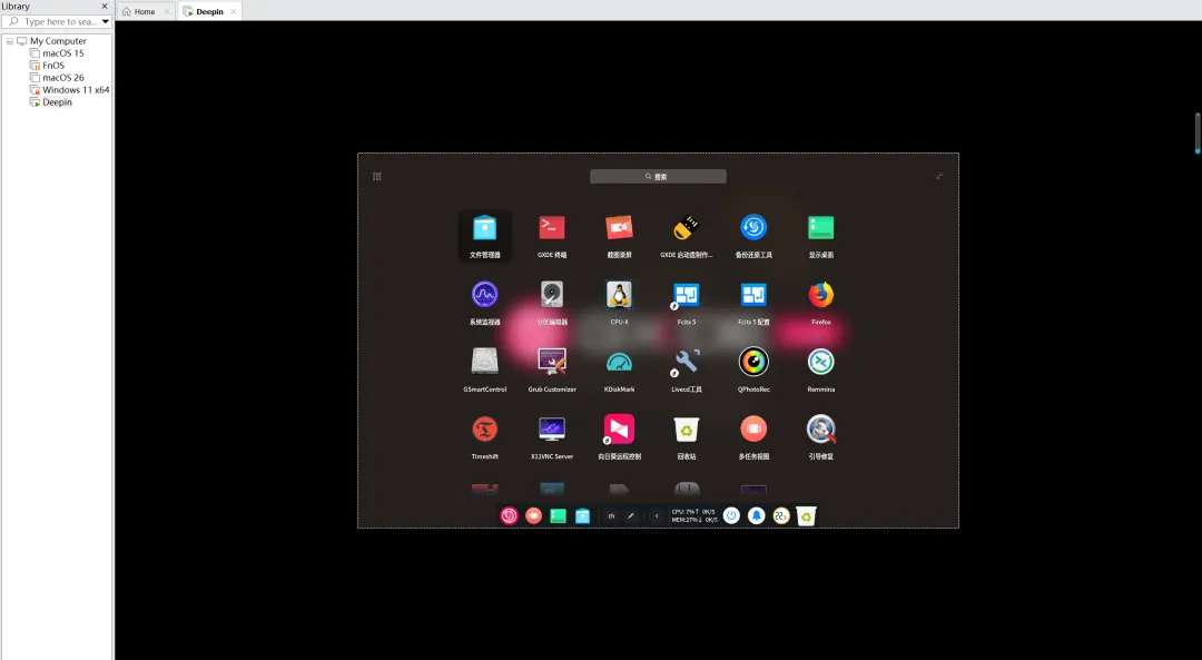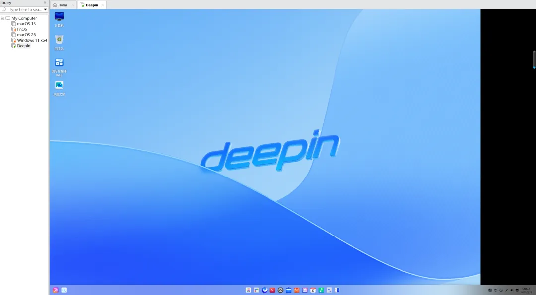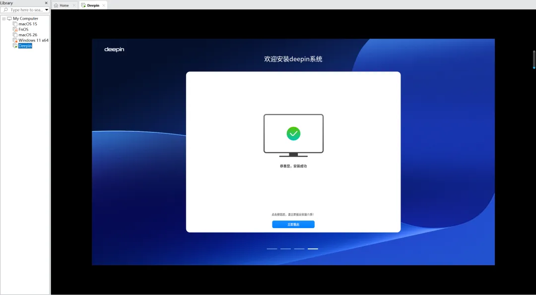此时只需点击“Finish”便完成了虚拟机的安装,此时在虚拟机主页面便能看到创建的 Deepin 虚拟机: