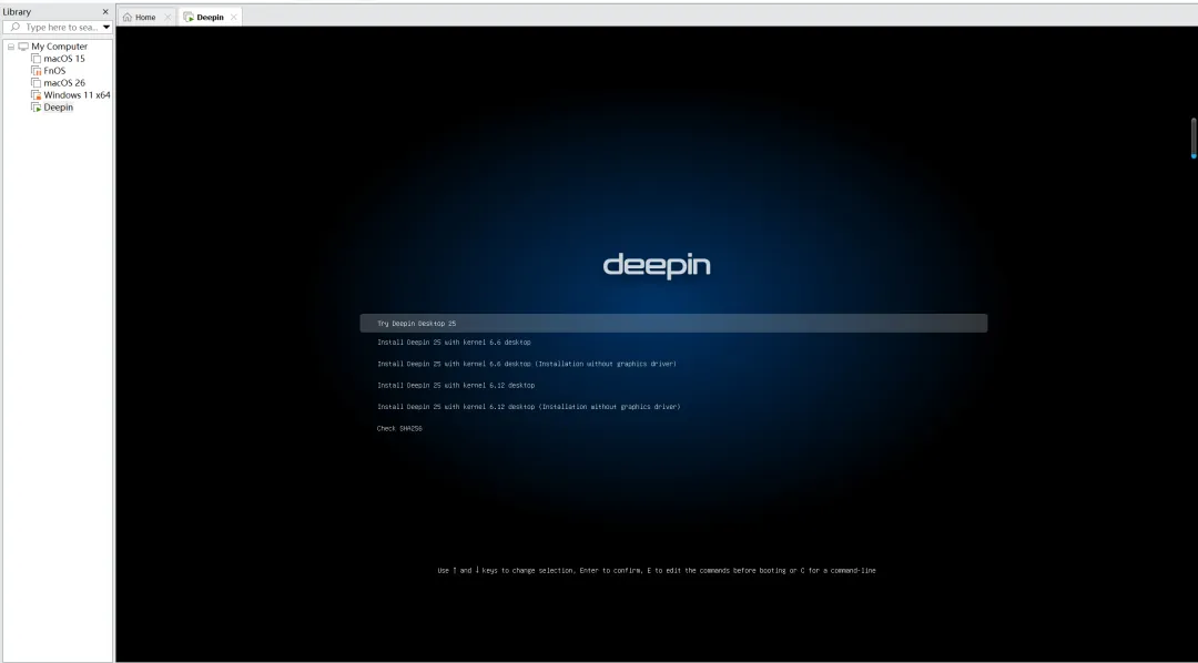 第一个选项为体验选项,可在不安装的前提下查看 Deepin 有哪些功能。这里我直接进行安装。选择最下面的“Install Deepin 25 with kernel 6.12 desktop (Installation without graphics driver)” 后按 Enter 键确认后会加载对应的数据: