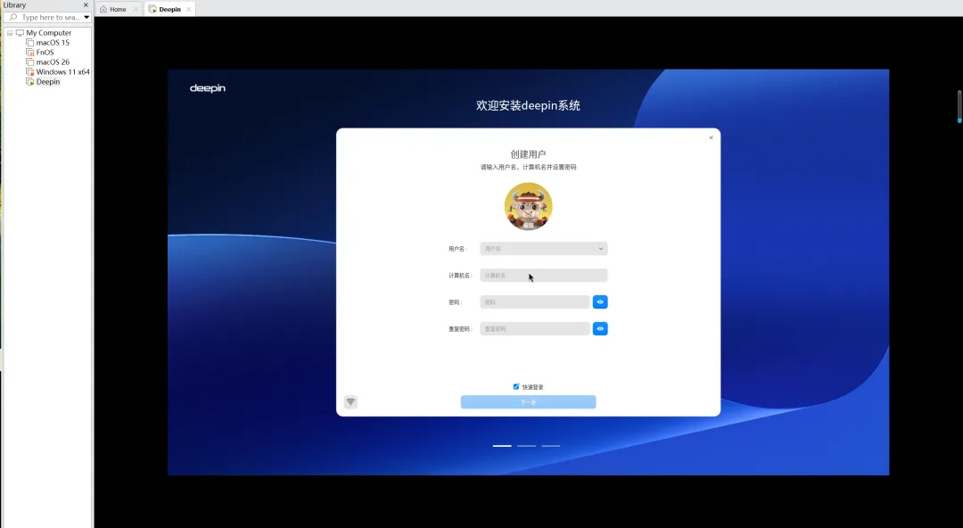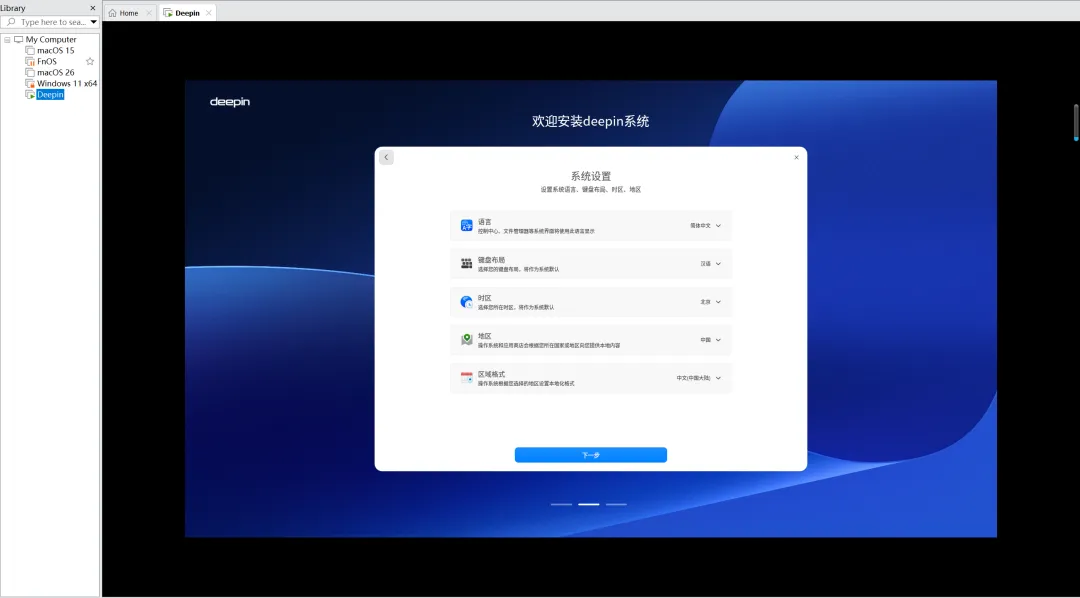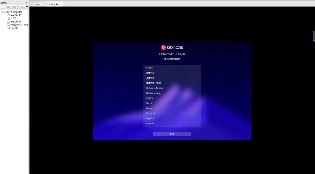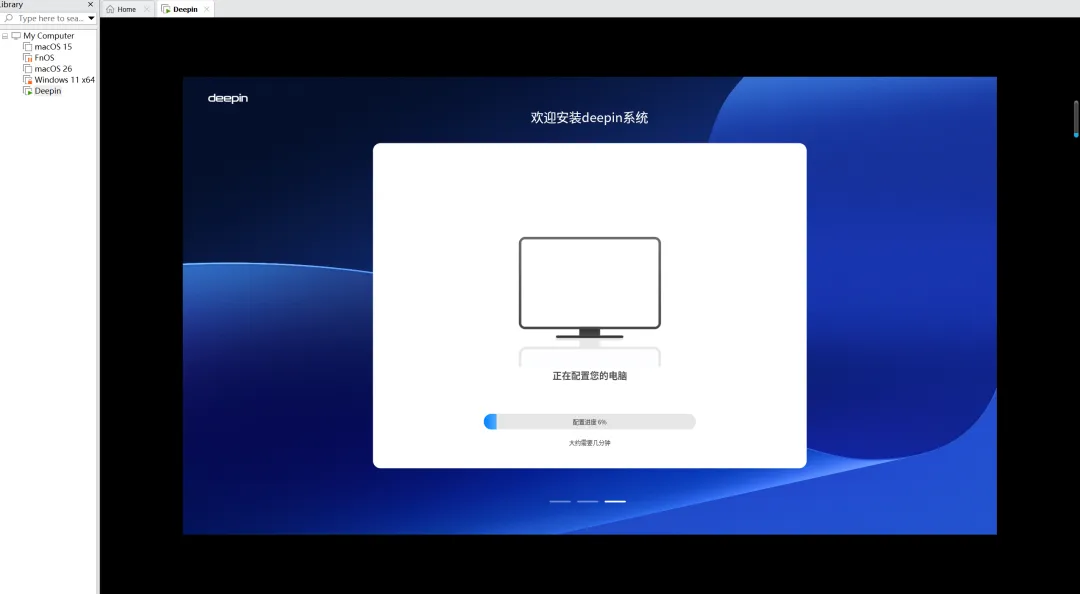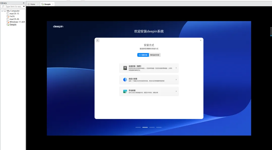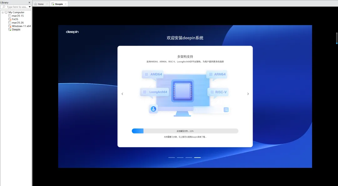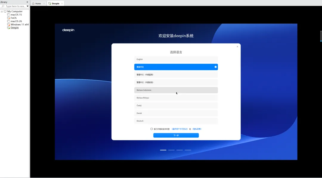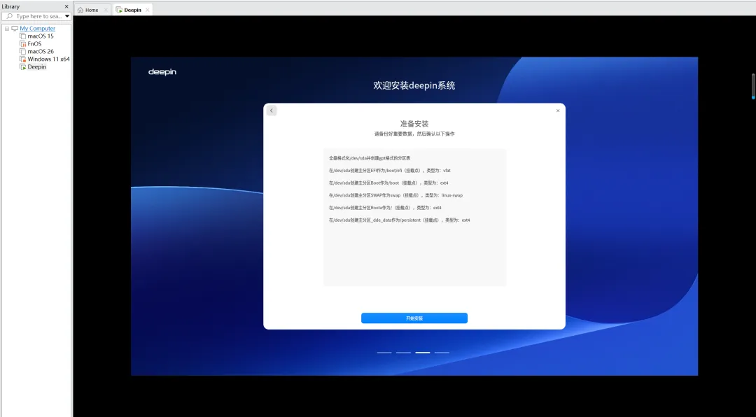 点击开启虚拟机后,等待一会便会显示 Deepin 的安装页面: