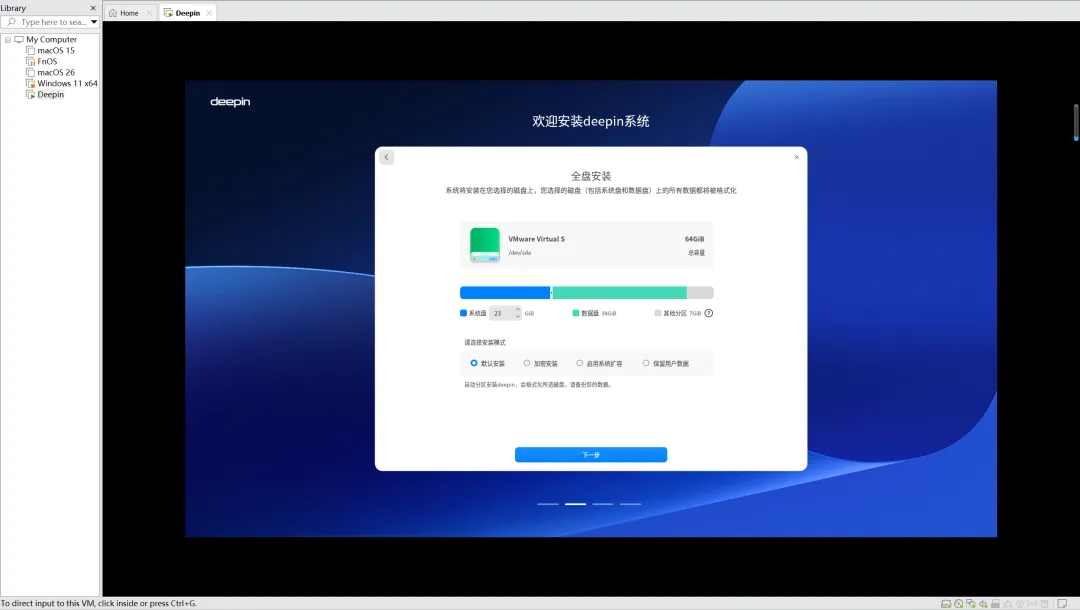 这里共提供了三种安装方式,若为虚拟机,则默认选全盘安装即可。若为真实物理机,可通过“自定义安装”来选择指定的磁盘分区进行安装,多用于 Windows 和 Deepin 共存的安装方式。我这里选“全盘安装”。选择后会跳转到全盘安装的配置页面: