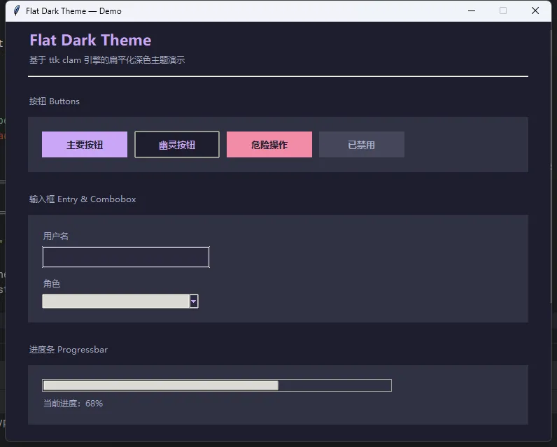 如果项目工期紧,想最快速度出效果,ttkbootstrap 是目前最成熟的选择。它是对 ttk 的封装,内置了十几套 Bootstrap 风格主题,引入成本极低,做过web前端的一看就知道怎么个玩意了。