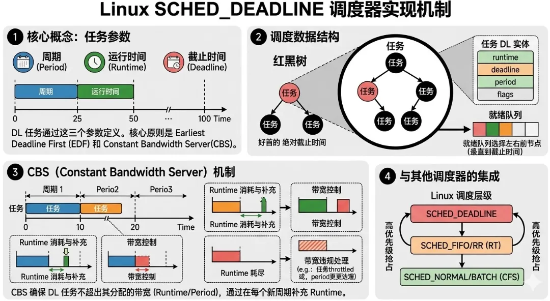 Deadline 调度器(Deadline I/O Scheduler)是 Linux 内核中用于块设备的请求调度算法之一。它最初设计的目标是解决传统 CFQ(Completely Fair Queuing) 调度器在高负载情况下出现的延迟不可控问题。CFQ 更强调公平性,但在对实时性和延迟敏感的应用场景下(如数据库、虚拟机磁盘 I/O),其随机延迟可能过大。Deadline 调度器通过引入 请求过期机制(deadline),保证每个请求不会被无限期延迟,从而在提供较高吞吐量的同时确保 I/O 延迟上限。