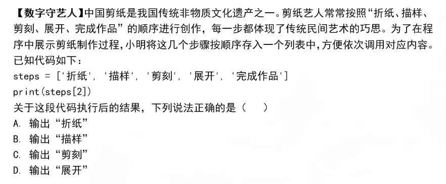 题目:已知 steps=['折纸','描样','剪刻','展开','完成作品'],print(steps[2])输出什么?
