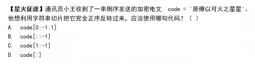 题目:将加密电文 code='原燎以可火之星星'完全正序反转,应使用哪句代码?